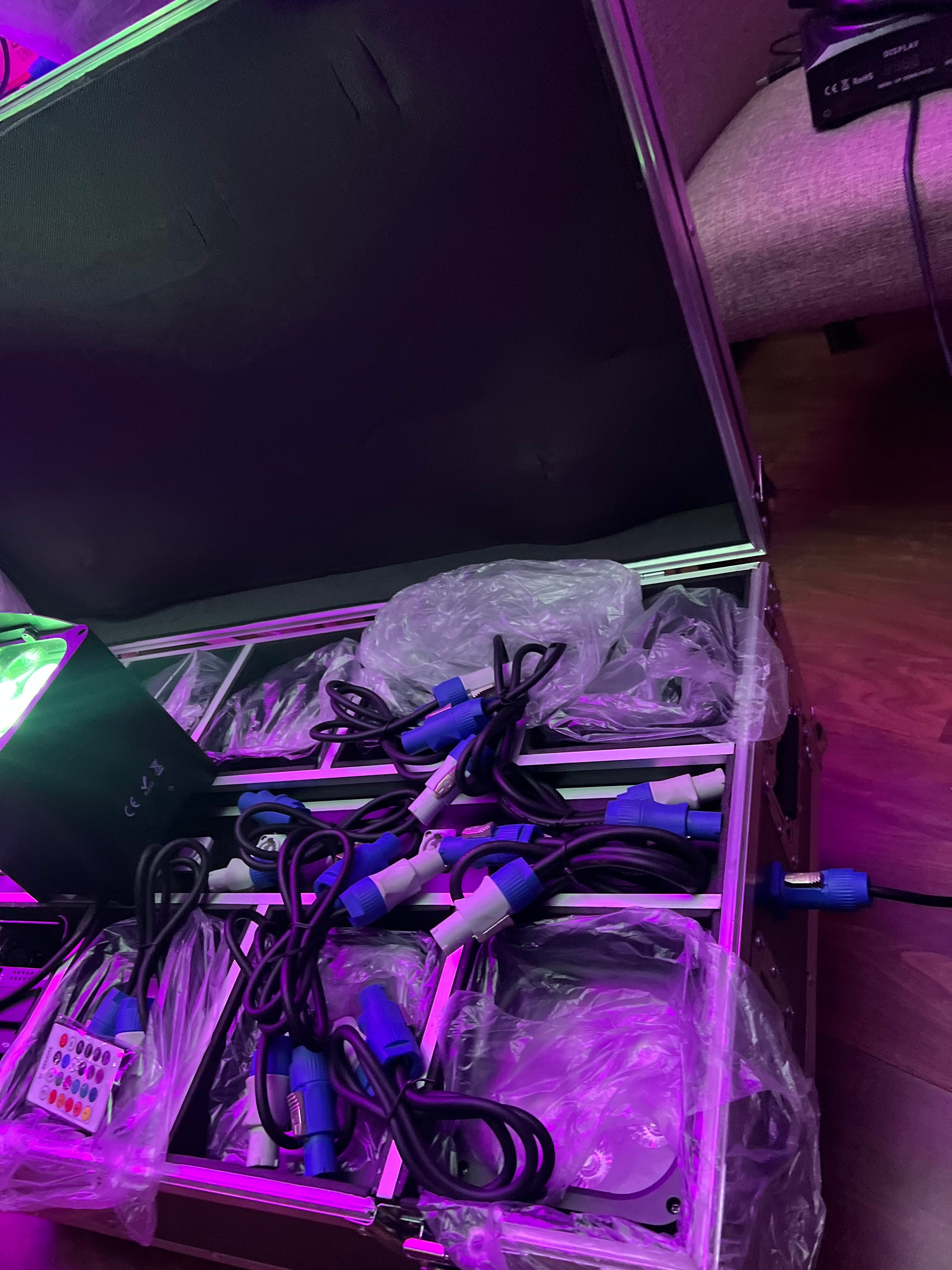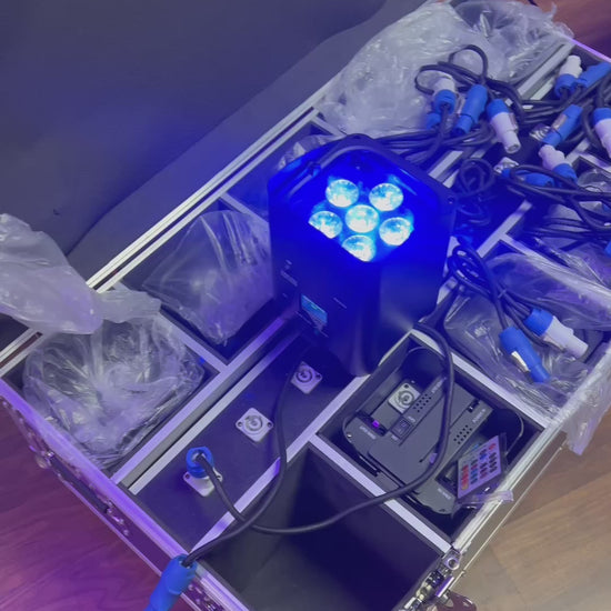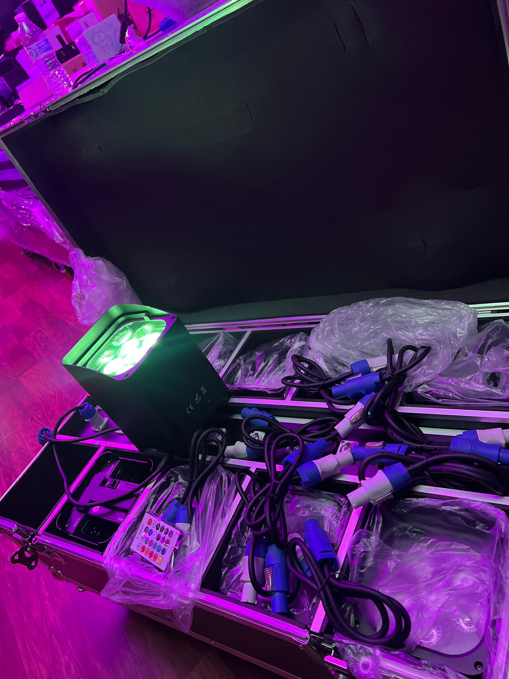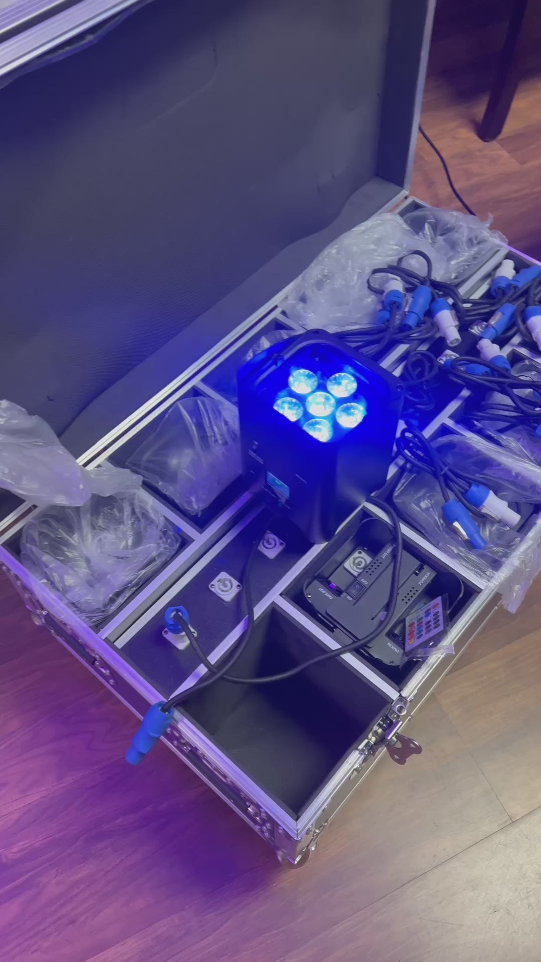 10 powerful Led wireless pars, including travel case, remotes, and charging cables. Multiple colors, modes, and DMX mode